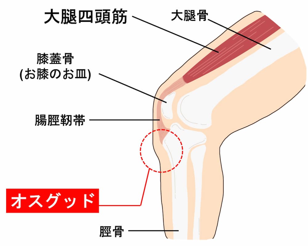 オスグッドは膝のお皿の下にある骨が少しずつ飛び出してくることで痛みが起こるケガのことです。